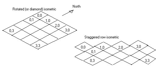 "Isometric tiles (tile = Kachel)" sind die Basis einer Vielzahl von Echtzeitspielen oder Rundenspielen wie Civ2, Age of Empires, Sim City oder Master of Magic. "Isometric tiles" werden erzeugt, indem man durch eine mindestens 45° grosse Rotation von rechtwinkligen Kacheln die Illusion erzeugt, dass Kacheln mit einem niedrigem Wert auf der Y-Achse weiter entfernt und Kacheln mit einem grösserem Wert auf der Y-Achse naher zu sein scheinen. Im Wesentlichen lassen sich zwei verschiedene Formen der Kachelanordnung unterscheiden, die "rotated" oder die "staggered" Anordungen. Das folgende Beispiel zeigt die Unterschiede der Anordnungsformen.